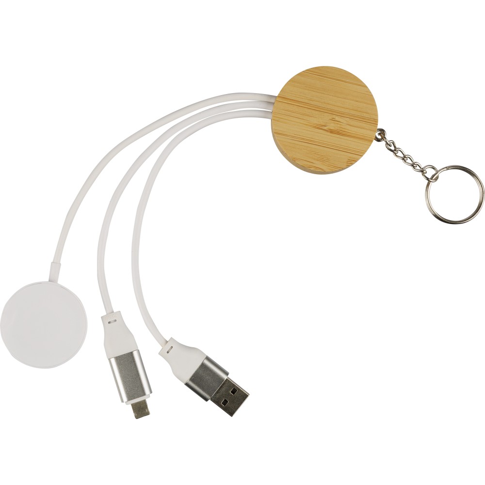 TPE anyagú töltőkábel szett bambusz csatlakozóházzal és fém kulcskarikával, kompakt kulcstartó kialakításban. Tartalmaz PD 65 W gyors töltésre alkalmas kábeleket (2 az 1-ben Type-C/Lightning és USB-A/USB-C), valamint univerzális okosóra töltőt. Barna kartondobozba csomagolva.