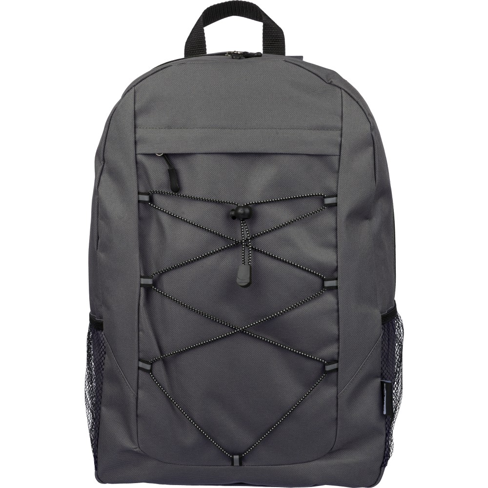 RPET poliészter 600D anyagból készült hátizsák húzózsinóros záródással és nagy cipzáras fő rekesszel. Hálós oldalzsebekkel, rugalmas elülső pántokkal, dekorációhoz kialakított kis elülső cipzáras zsebbel és állítható vállpántokkal rendelkezik. A terméken rPET alapanyagra utaló címke található.