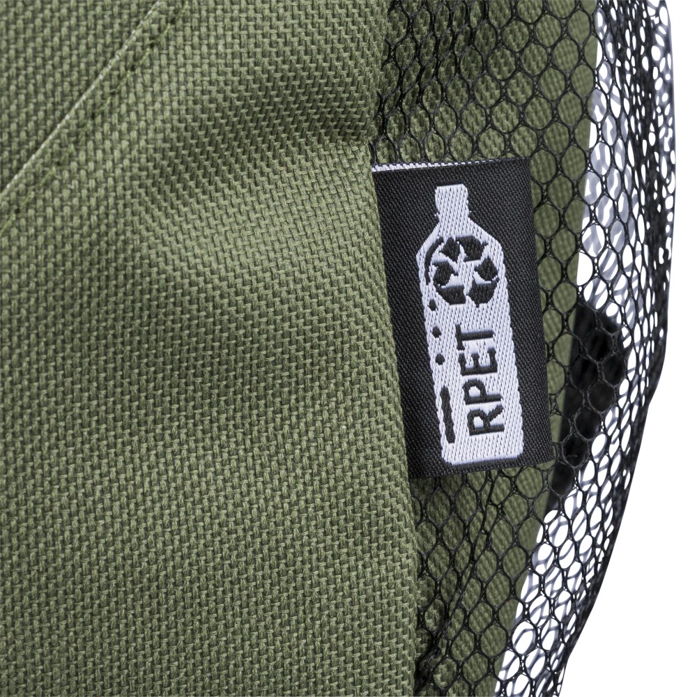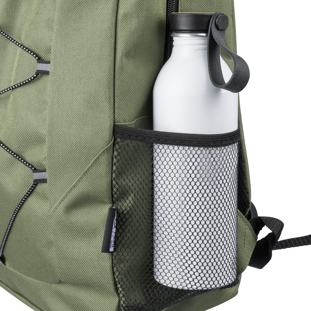 RPET poliészter 600D anyagból készült hátizsák húzózsinóros záródással és nagy cipzáras fő rekesszel. Hálós oldalzsebekkel, rugalmas elülső pántokkal, dekorációhoz kialakított kis elülső cipzáras zsebbel és állítható vállpántokkal rendelkezik. A terméken rPET alapanyagra utaló címke található.