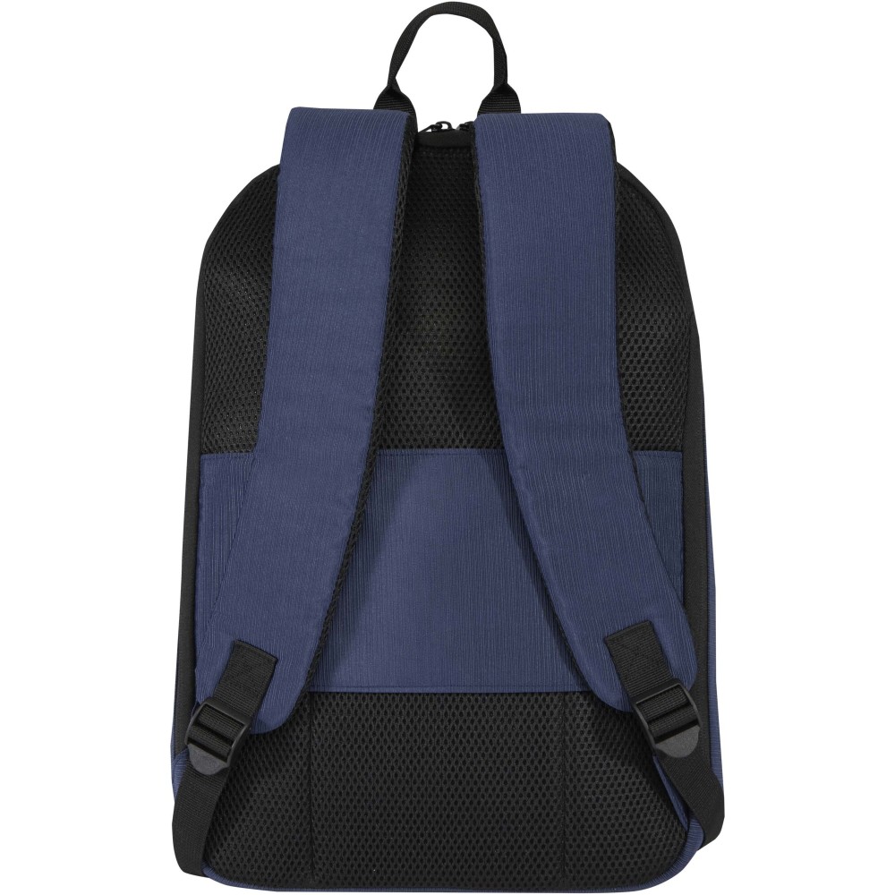Az újrahasznosított jacquard poliészterből készült, színben passzoló RPET béléssel ellátott Luma 15" lopásgátló hátizsák az intelligens védelmi funkciókat ötvözi a letisztult stílussal. A biztonsági megoldások közé tartoznak a zárható cipzárak (a lakat nem tartozék), valamint egy rejtett hátsó zseb, amely egyben bőröndkocsi-pántként is funkcionál. Az anyag vízlepergető tulajdonságú, így megvédi az értéktárgyakat az enyhébb esőtől. A táska belsejében egy párnázott rekesz található legfeljebb 15" méretű laptopok számára, emellett külön tablettartó zseb, tolltartó hurokkal ellátott nyitott rekesz és rendszerezők segítik a kiegészítők tárolását. A kényelmet a párnázott vállpántok és a légáteresztő hátrész biztosítják, a hátizsák elején pedig fém emblémázó lemezek találhatók. Legyen szó munkába járásról, repülőtéri közlekedésről vagy iskolai használatról, ez az öko hátizsák egész napos kényelmet nyújt.