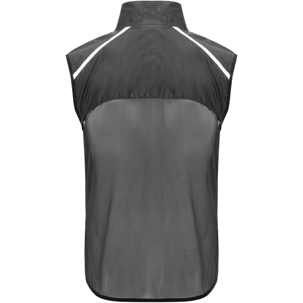 Szélálló és légáteresztő. Elülső cipzár azonos színű állvédővel. Rugalmas szegély a karkivágásnál és az alján. A hát alsó része mikroperforált anyagból készült. Fényvisszaverő csíkok a vállán. Zseb rugalmas pánttal, amelybe a mellényt el lehet csomagolni. Eltávolítható címke.