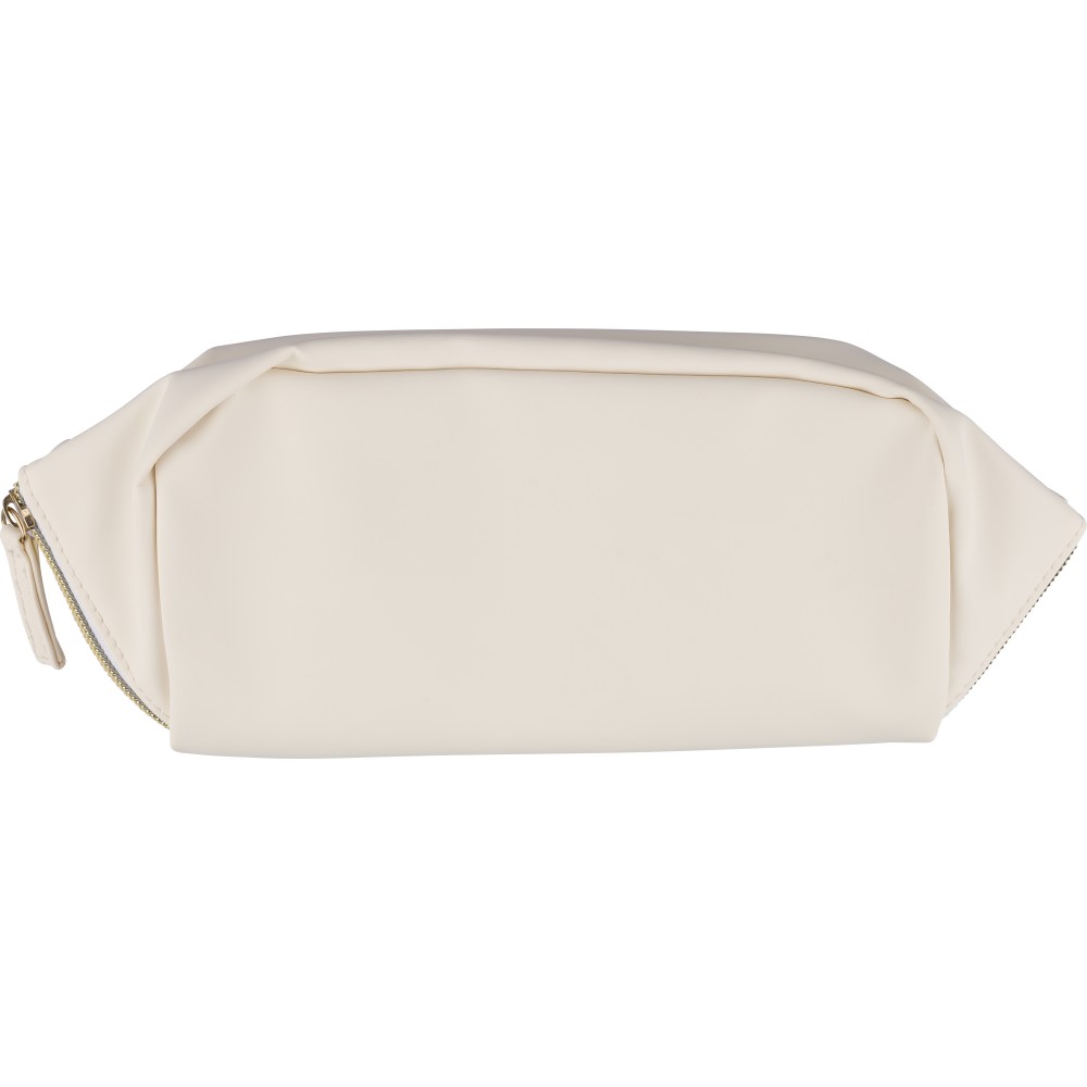 Újrahasznosított PU anyagból készült neszesszer középen elhelyezett cipzárral a széles nyithatóság érdekében. Rövid fogantyúval, tágas belső térrel és négy rekesszel, beleértve egy belső cipzáras zsebet. 210D újrahasznosított béléssel készült, belsejében egy újrahasznosított alapanyagra utaló címkével.