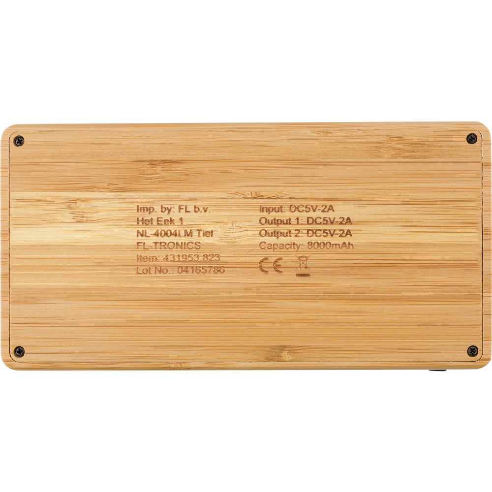 Bambusz napelemes powerbank 8.000 mAh kapacitással. Két USB és egy micro USB csatlakozóval, négy LED jelzőfénnyel. Bemenet: DC 5V/2A, kimenet: DC 5V/2A. A vezetéket tartalmazza. Veszélyes áru, csomagban nem küldhető.