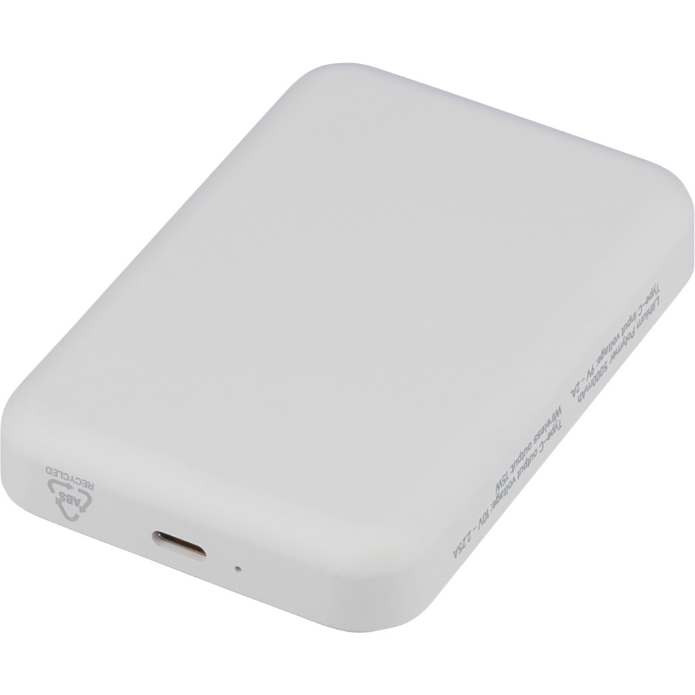 Újrahasznosított ABS anyagból készült vezeték nélküli töltős powerbank 5 000 mAh kapacitással és 15 W MagSafe kompatibilis vezeték nélküli töltéssel. Type-C in/out csatlakozással, beépített biztonsági védelmekkel és automatikus kikapcsolási funkcióval. Nem MagSafe készülékekhez fémgyűrűt tartalmaz. Az oldalán gravírozott recycled (újrahasznosított) alapanyagra utaló logó található. Selyempapírral bélelt barna dobozba csomagolva.
