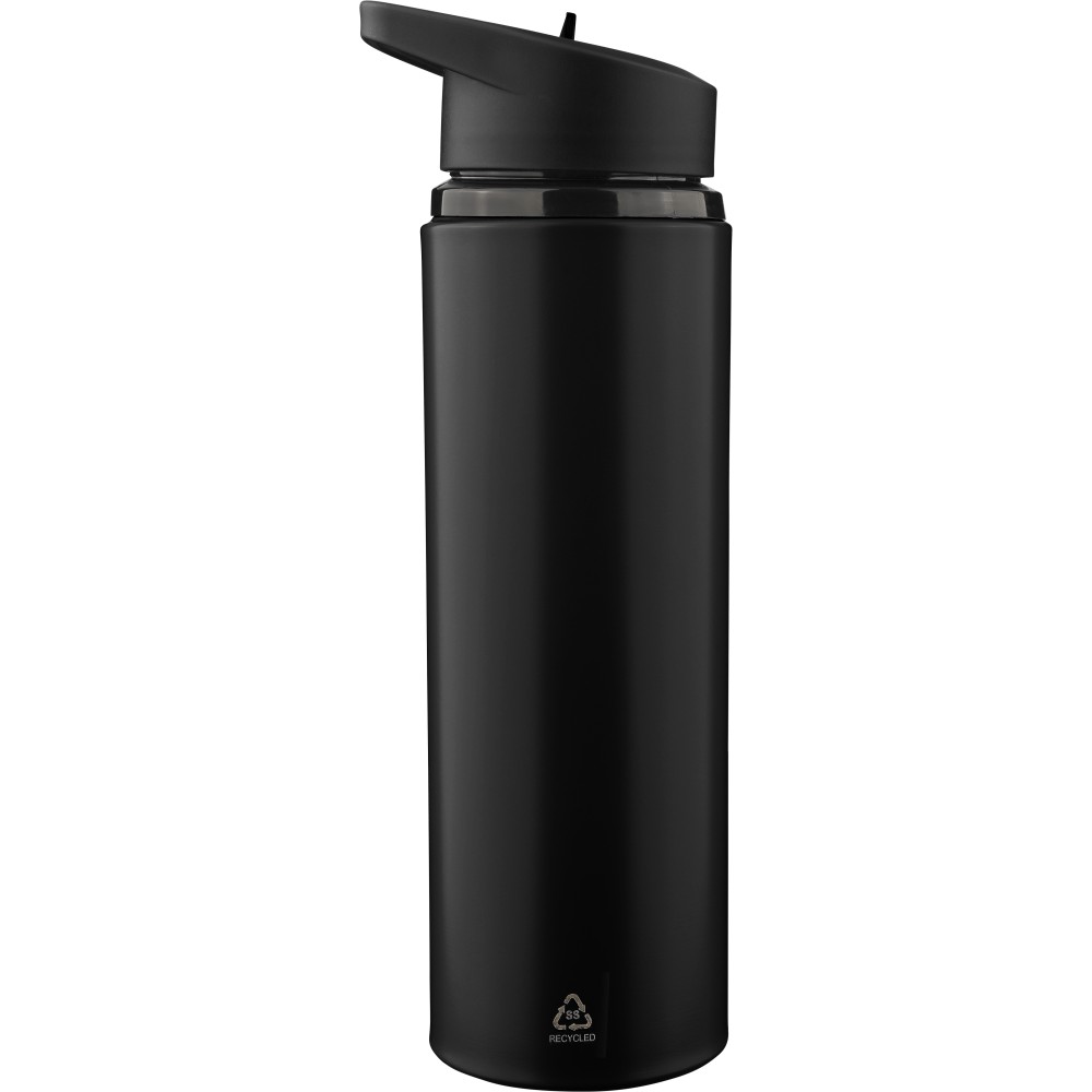 Újrahasznosított rozsdamentes acélból készült, egyfalú ivópalack rozsdamentes acél 304 anyagból, PP csavaros kupakkal, hordozófüllel, felhajtható ivószárral és belső szívószállal. Kizárólag hideg italokhoz használható, űrtartalma 500 ml. A palacktesten gravírozott recycled (újrahasznosított) alapanyagra utaló logó található. Darabonként barna kartondobozba csomagolva.