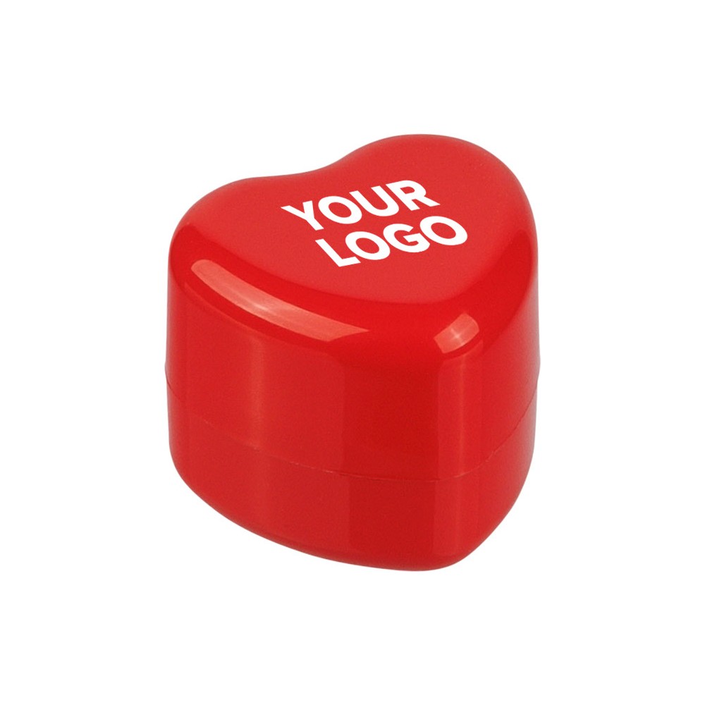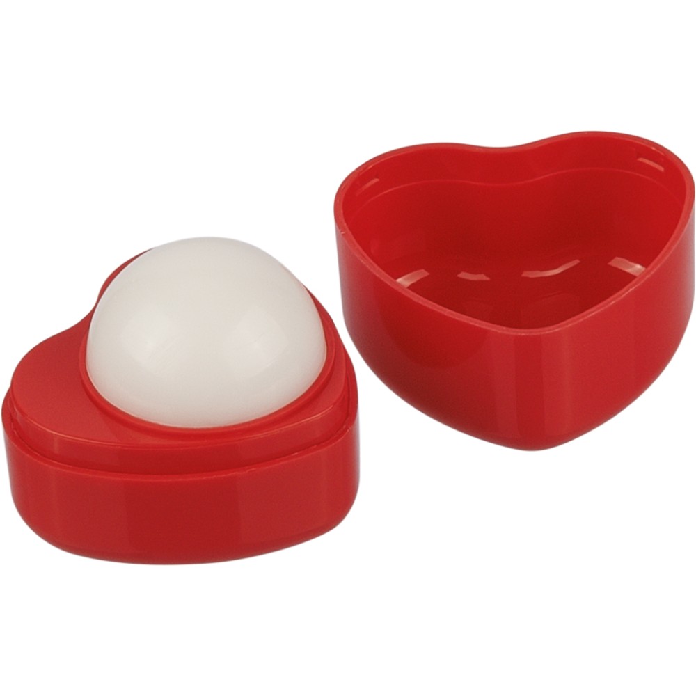 PP anyagból készült szív alakú tégely, benne 5,5 g vanília illatú ajakbalzsammal.
